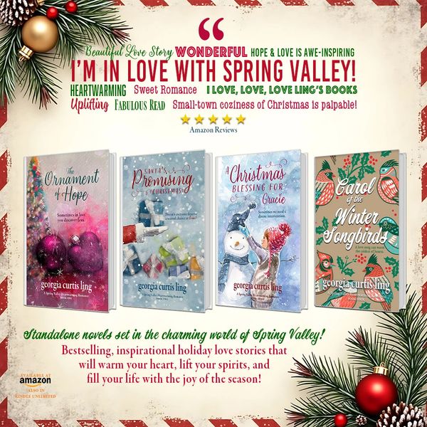 Georgia Curtis Ling was born and raised in the foothills of the Appalachian Mountains in Eastern Kentucky. Influenced by her heritage, Georgia has a unique voice in contemporary Christian literature. Her passion for storytelling shines through in every page, inviting readers into her imaginative worlds. An inspirational storyteller of hope-filled fiction, she is the bestselling author of the beloved Spring Valley Series that celebrates faith, love and romance in a charming Appalachian town. The series, including The Ornament of Hope, Santa’s Promising Christmas, A Christmas Blessing for Gracie, and Carol of the Winter Songbirds are novels rich with voices from the past, memories of heartwarming stories, and traditions of her cherished Appalachian heritage.